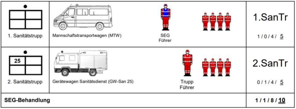 Ausbildungen. Dazu gehört eine Sanitätsausbildung, drei verschiedene SEG-spezifische Module, die Helfergrundausbildung inkl. Sprechfunk und eine Grundausbildung Technik und Arbeitssicherheit.
